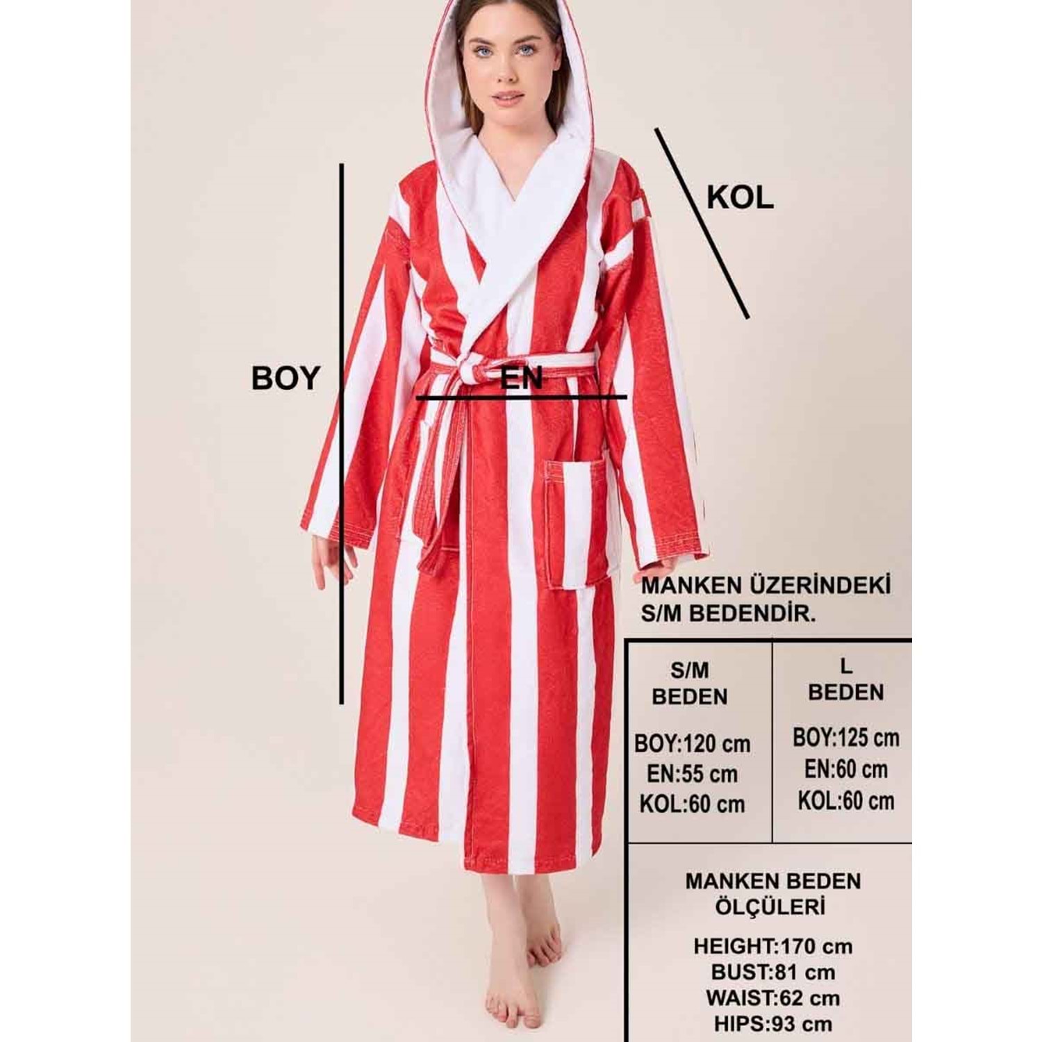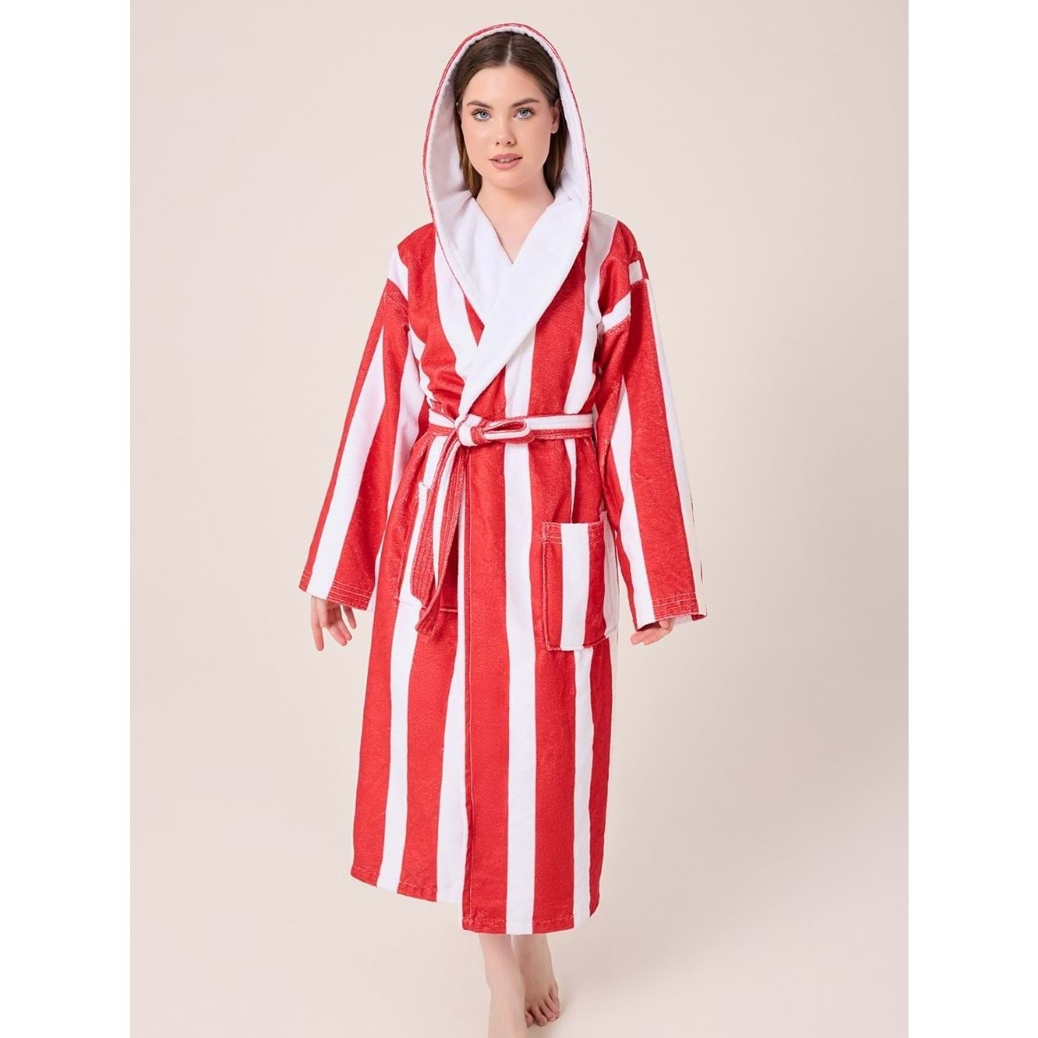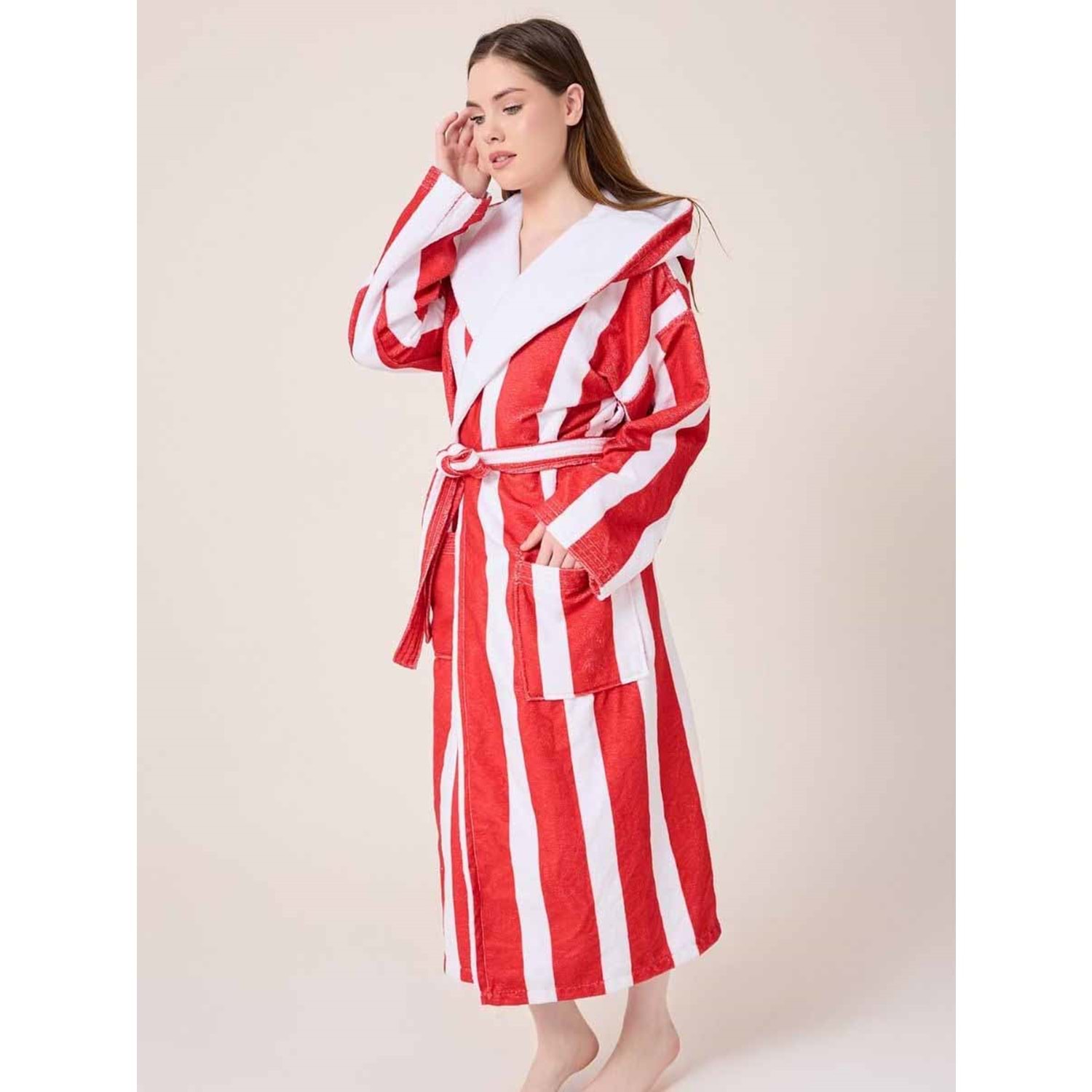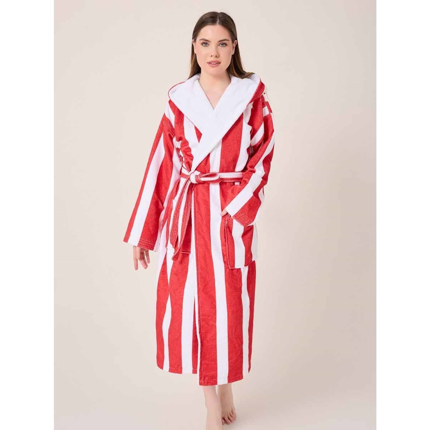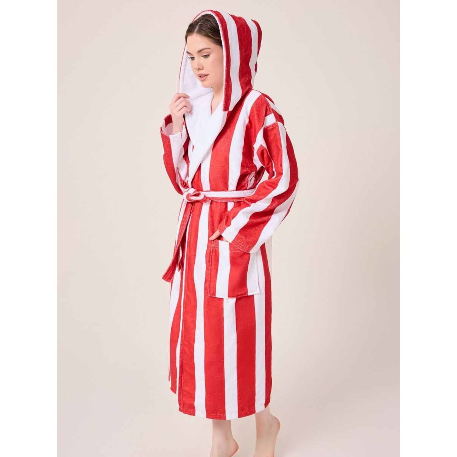 Çizgili Desenli Dijital Baskılı Kapüşonlu Bornoz BORDO