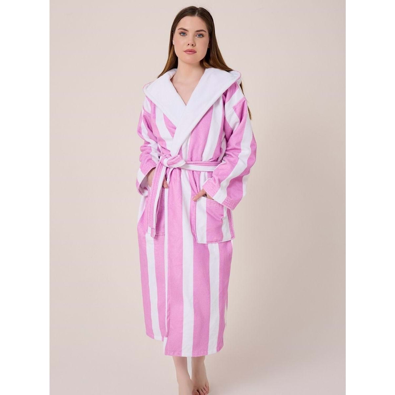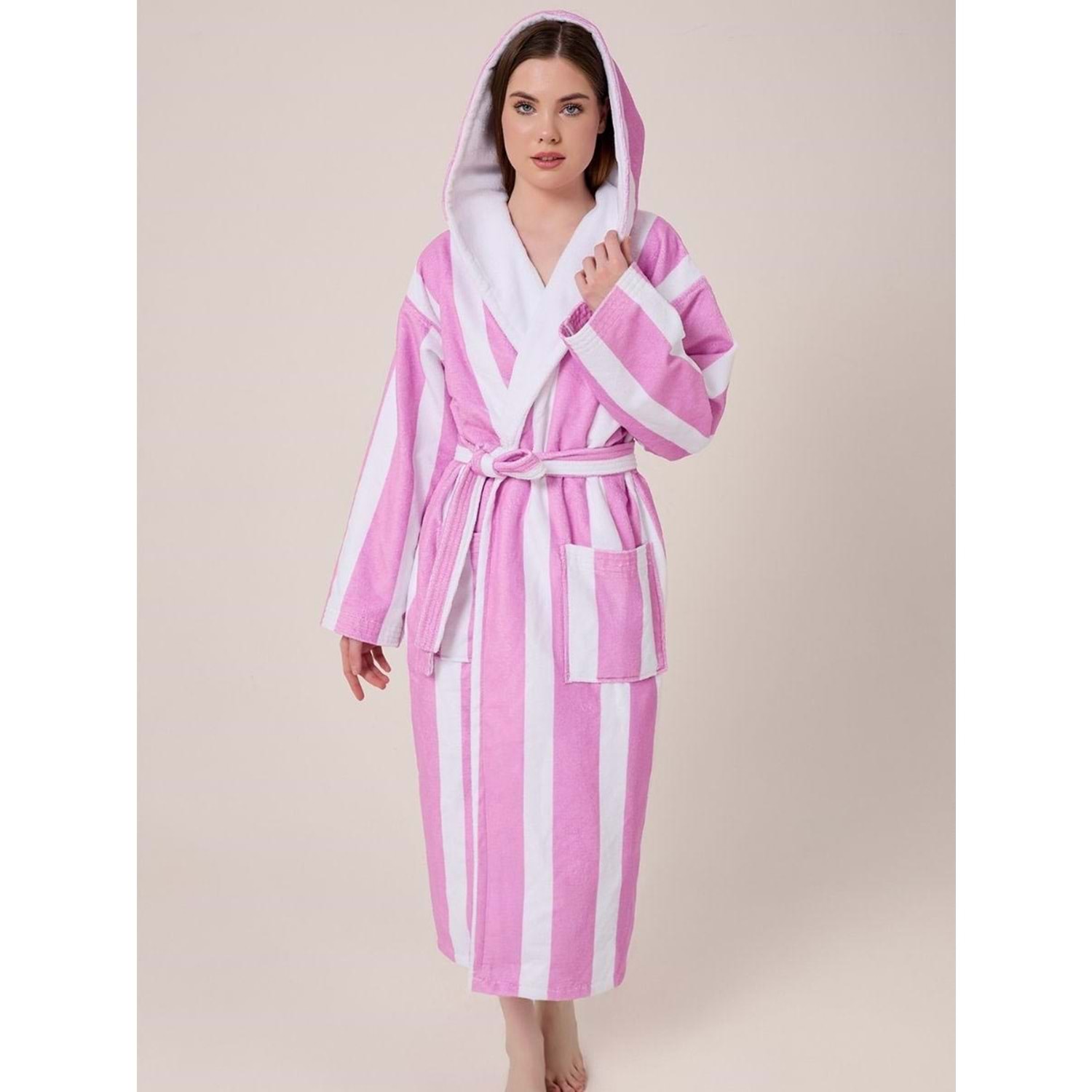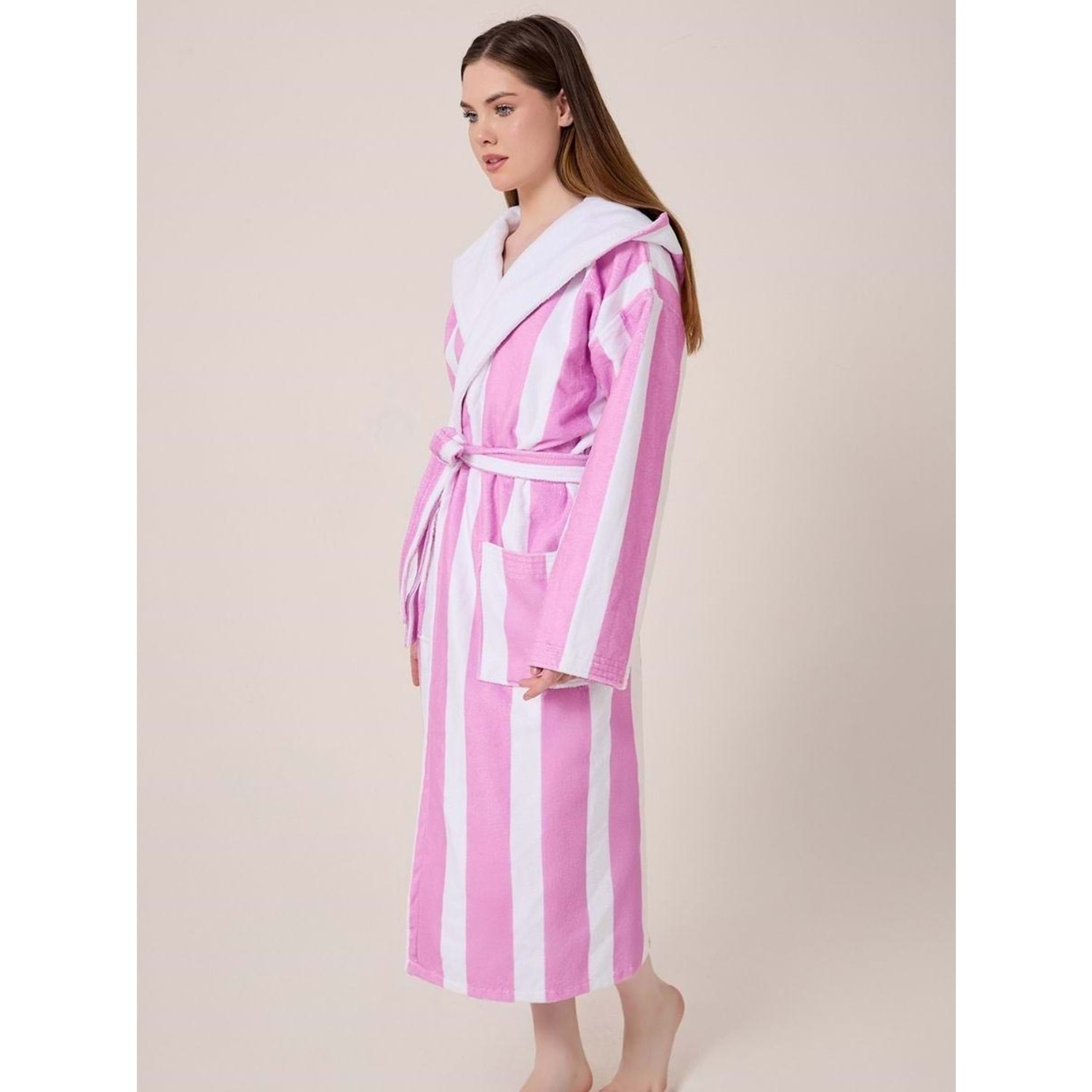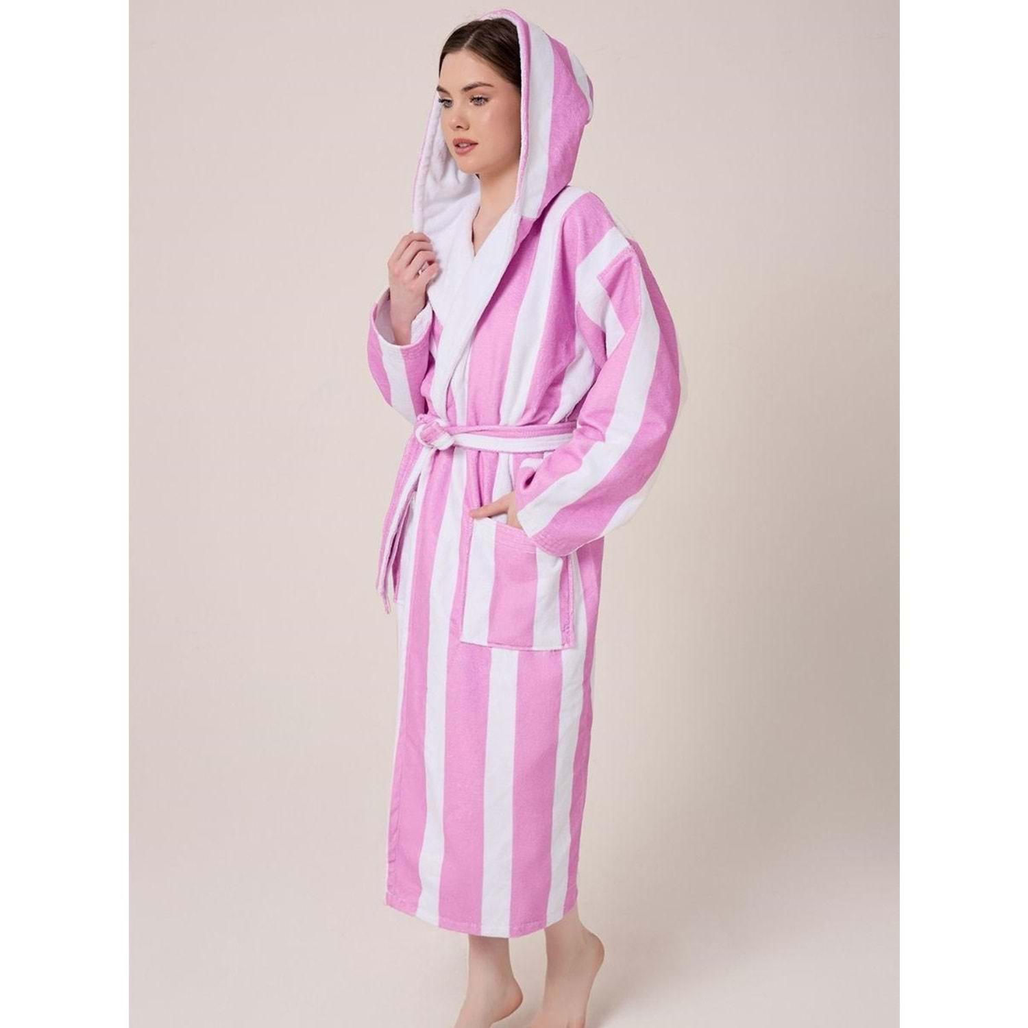 Çizgili Desenli Dijital Baskılı Kapüşonlu Bornoz LİLA
