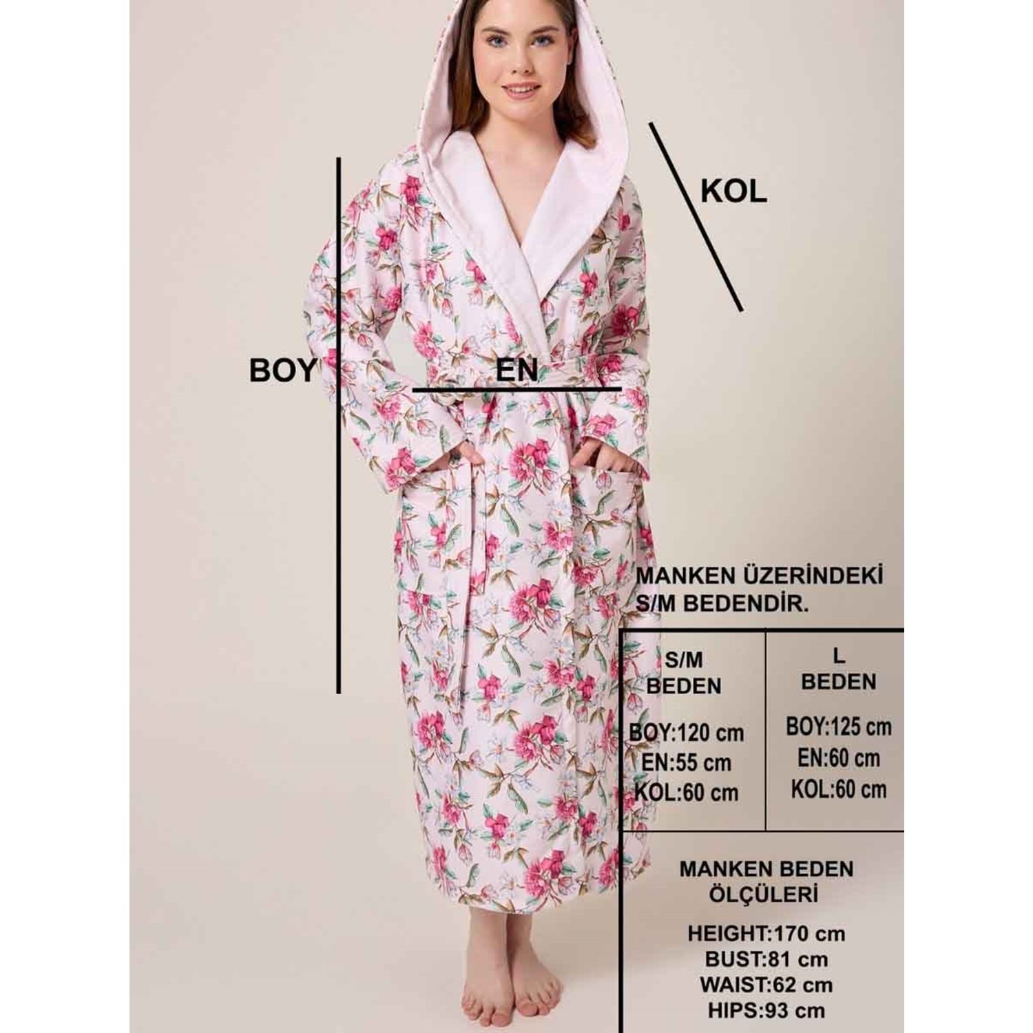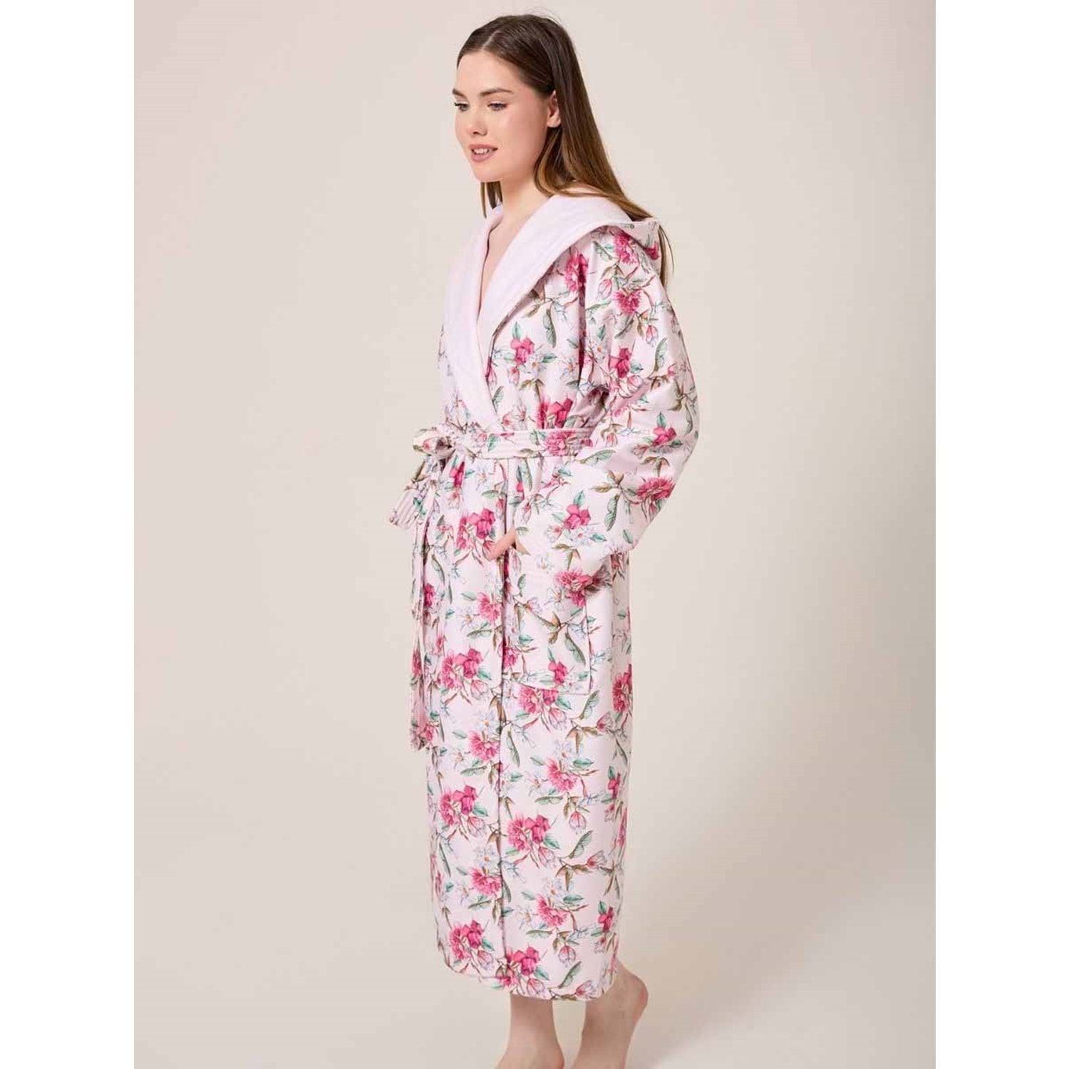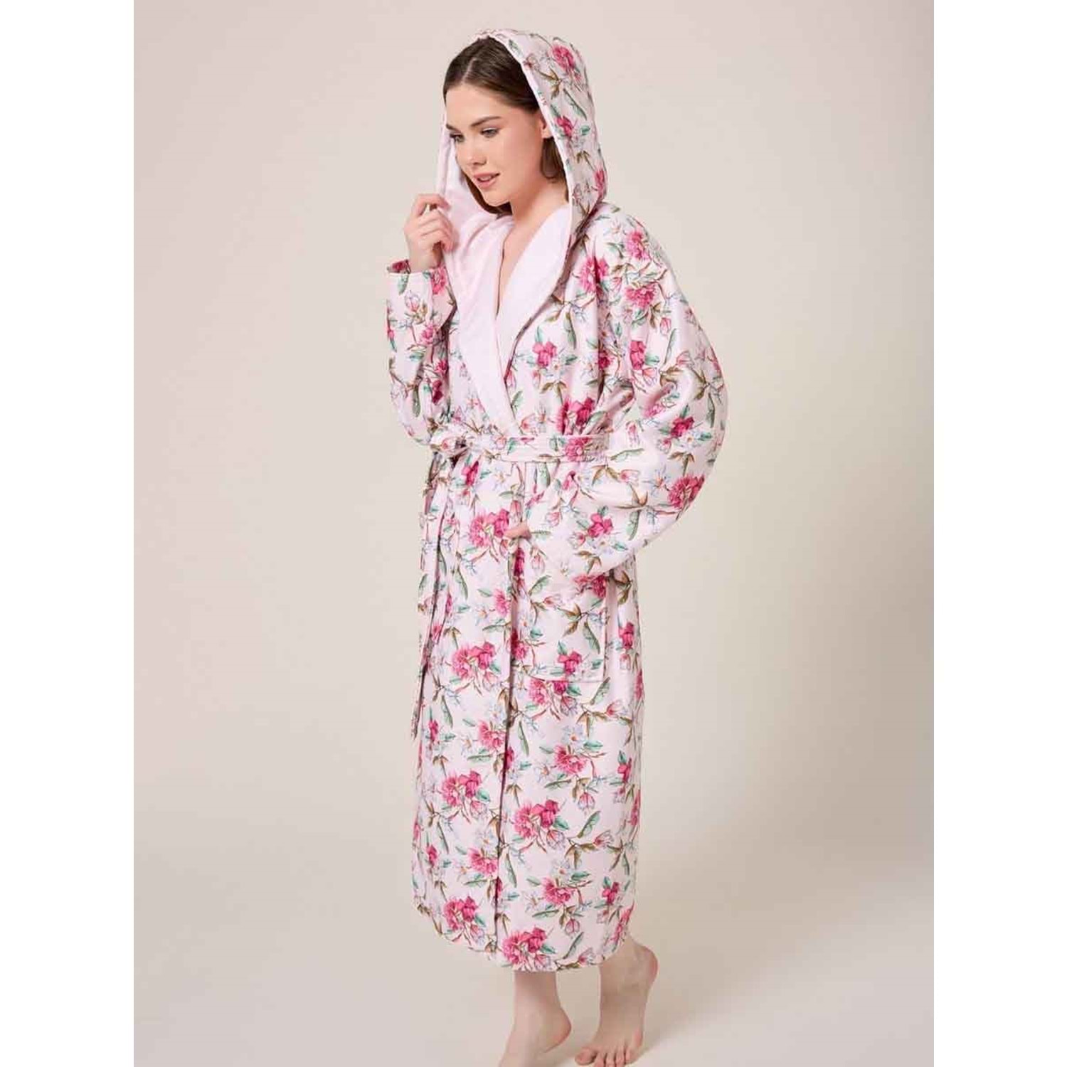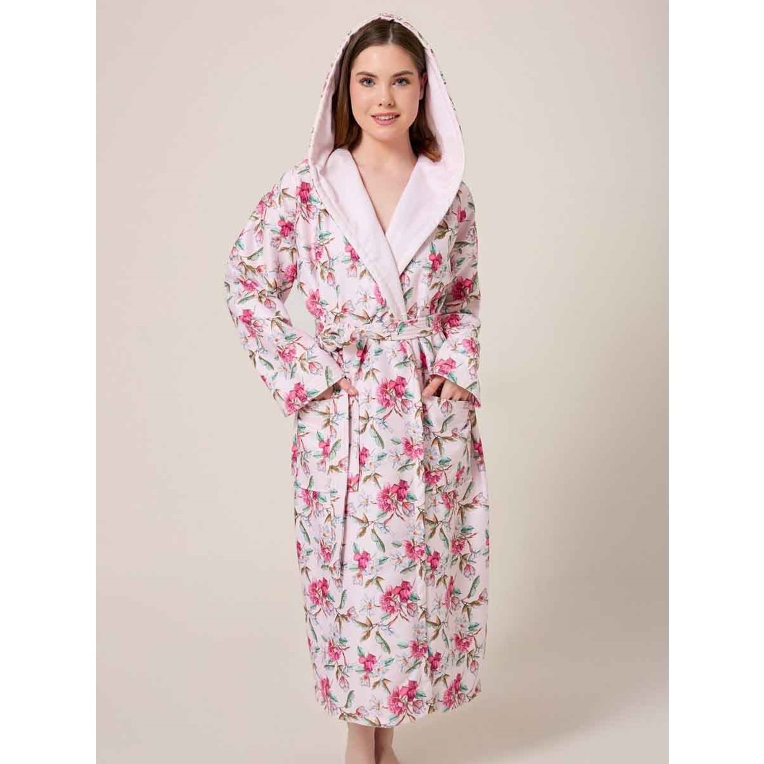 Kiraz Çiçeği Desenli Dijital Baskılı Kapüşonlu Bornoz