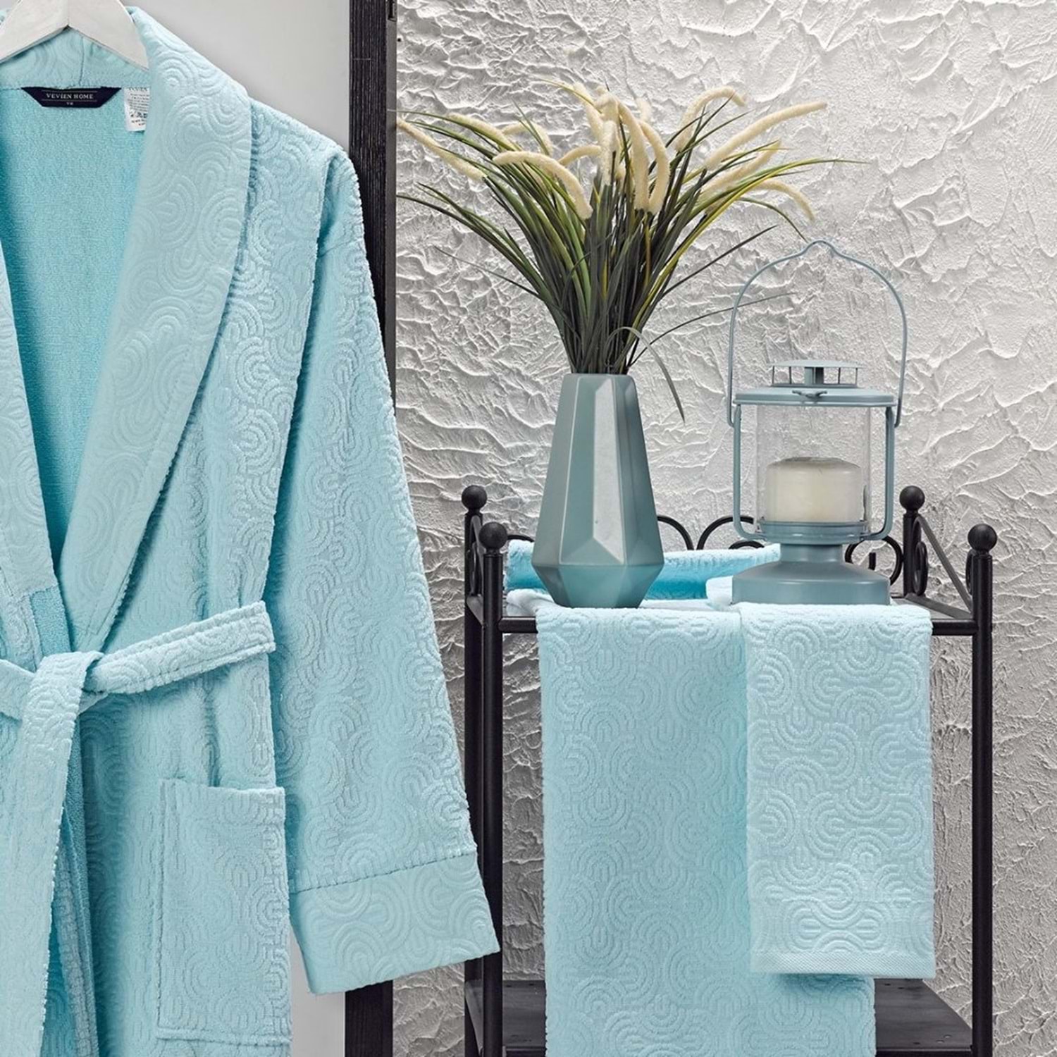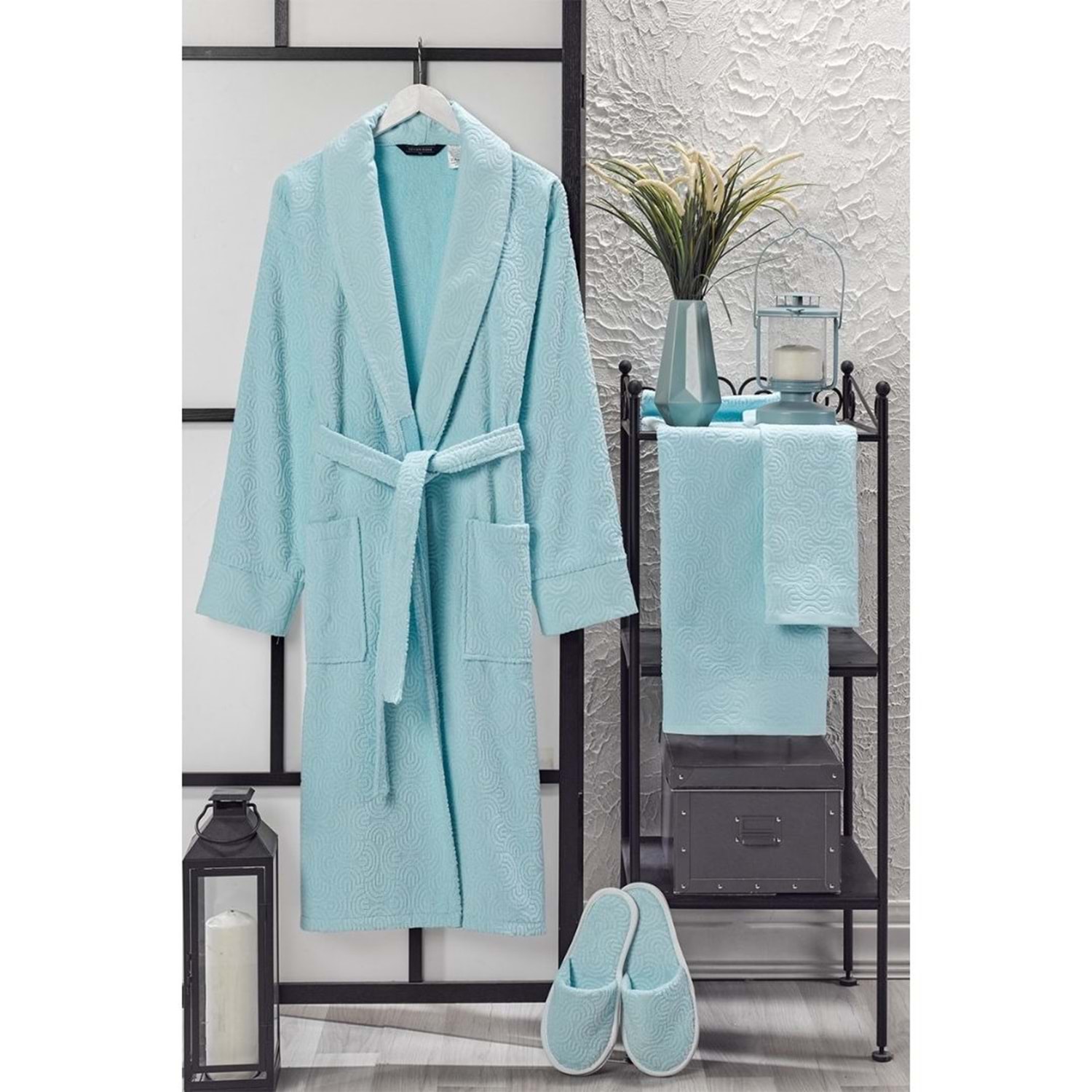 VevienHome Kadife Jakarlı 4 Parça Bornoz Takımı AÇIK MAVİ L Beden