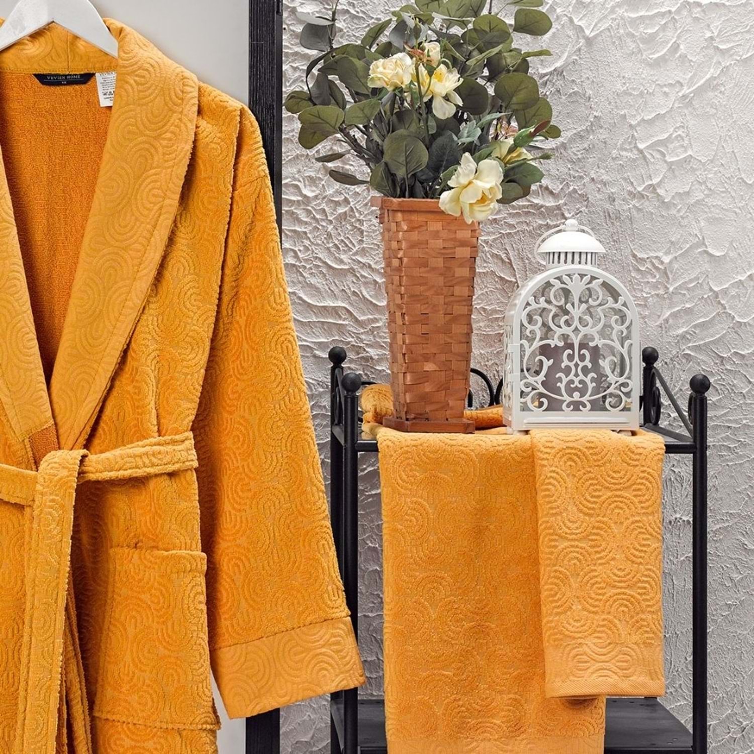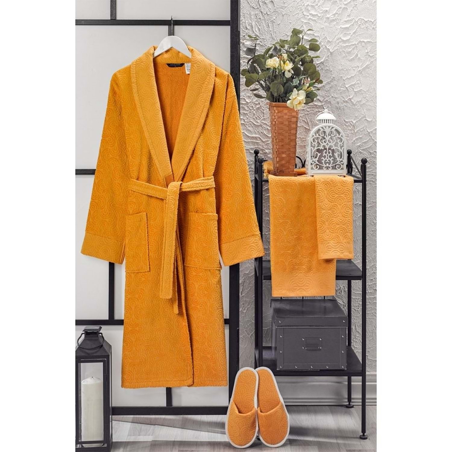 VevienHome Kadife Jakarlı 4 Parça Bornoz Takımı HARDAL L Beden