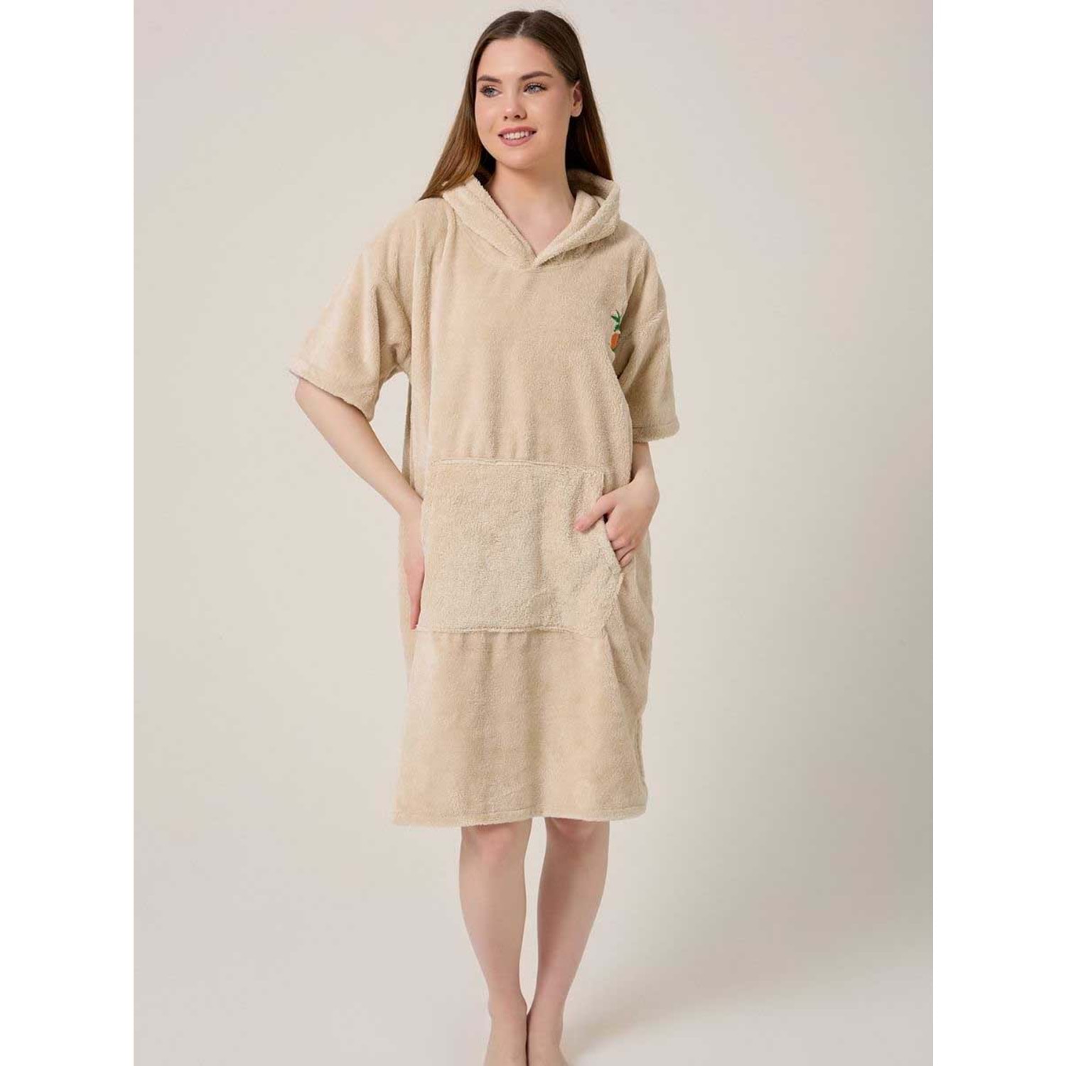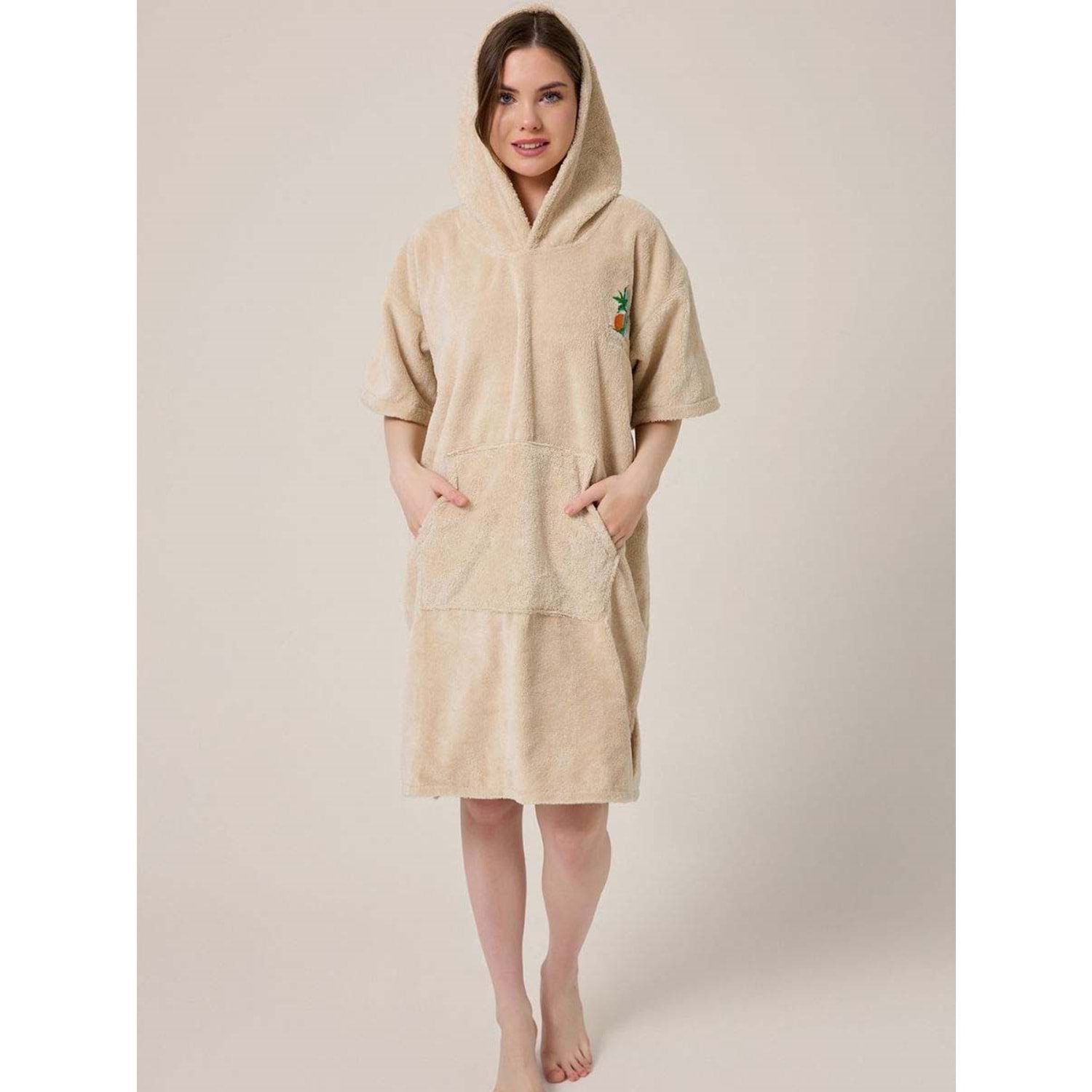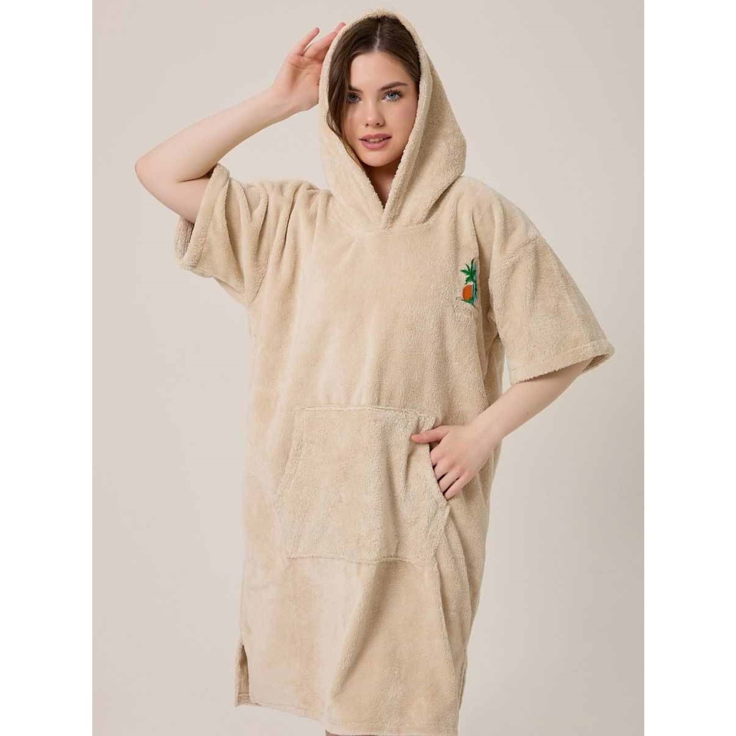 Palmiye Sörf Nakışlı Yetişkin Sörf Yazlık Panço Kapüşonlu Plaj Havlusu BEJ